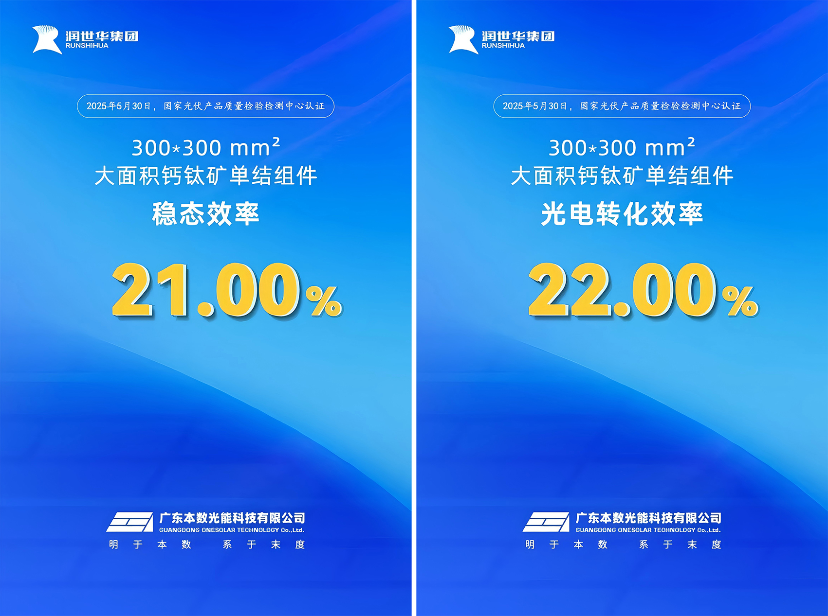 2025年5月30日,润世华控股集团旗下广东本数光能科技公司研发的300*300mm²大面积刚性钙钛矿单结组件,经国家光伏产品质量检验检测中心认证,光电转化效率达到了22.00%,其最大功率点跟踪(MPPT)稳态效率达到21.00%,并且对标国际稳态测试要求,测试全过程稳态效率波动小于0.01%(相对初始值),稳定性优异。这一效率标志着本数光能公司钙钛矿光伏技术产业化验证能力跻身国内同行业领先水平。