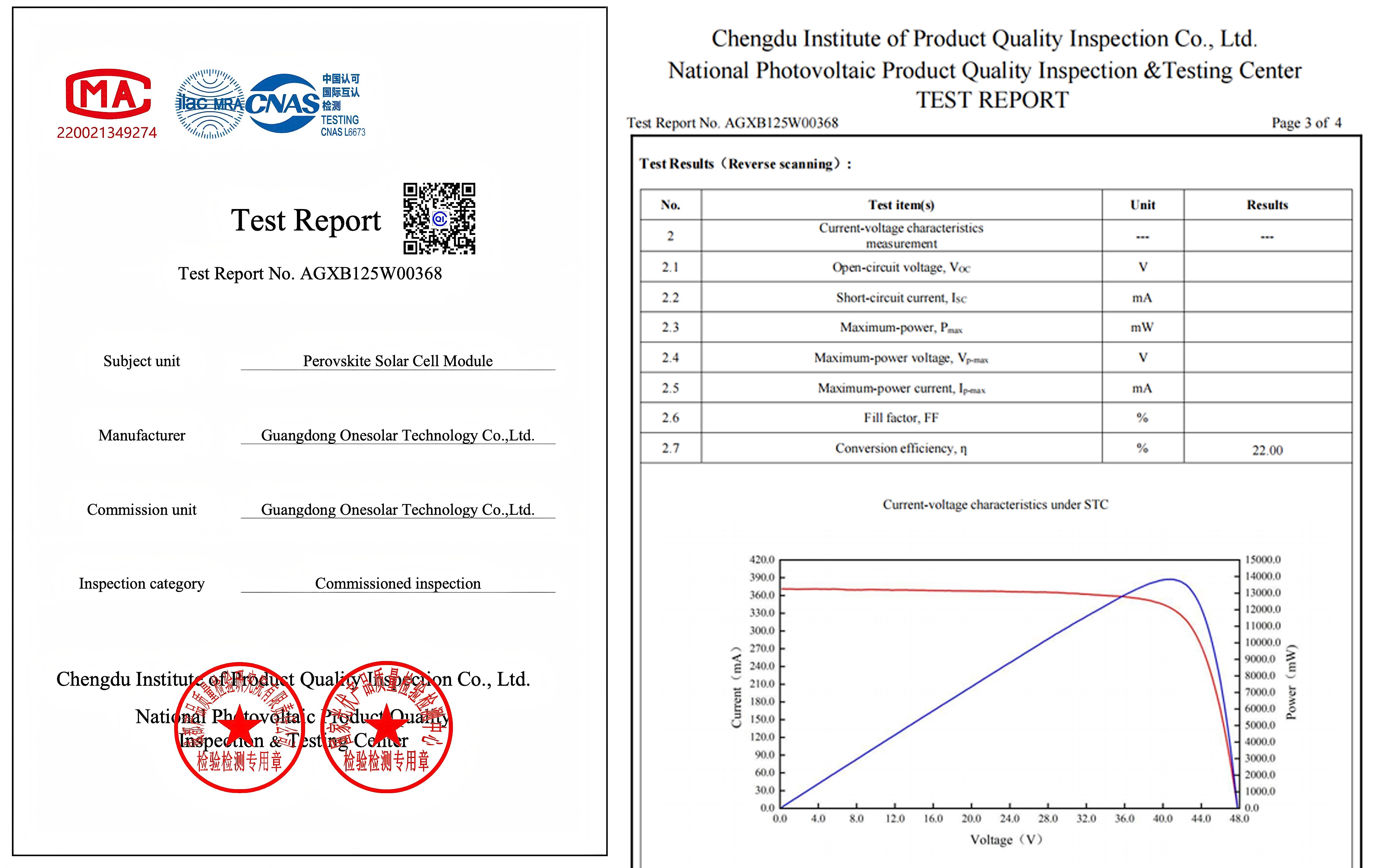 自2024年11月本数光能公司钙钛矿光伏10MW小试线建成以来,公司技术团队秉持“明于本数,系于末度”的企业理念,持续深耕钙钛矿材料科学、器件物理及核心工艺,在材料配方优化、界面工程、大面积均匀成膜及稳定性提升等核心技术环节实现了系统性突破。仅用半年时间,300*300mm²大面积单结组件认证效率,实现了从产品下线后的19.24%到20.41%再到22.00%的连续突破与显著跃升,高效地研发出了具备行业一流性能的大面积单结组件,进一步巩固了公司在钙钛矿光伏技术领域的研发实力,更为其后续大规模产业化进程奠定了坚实的技术基础。