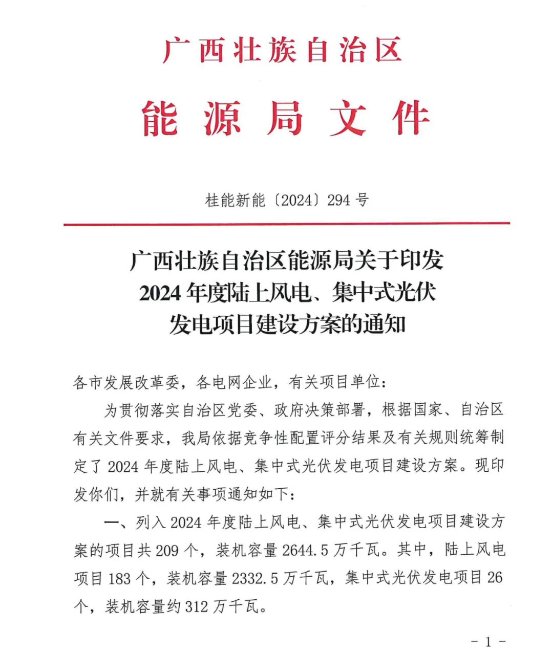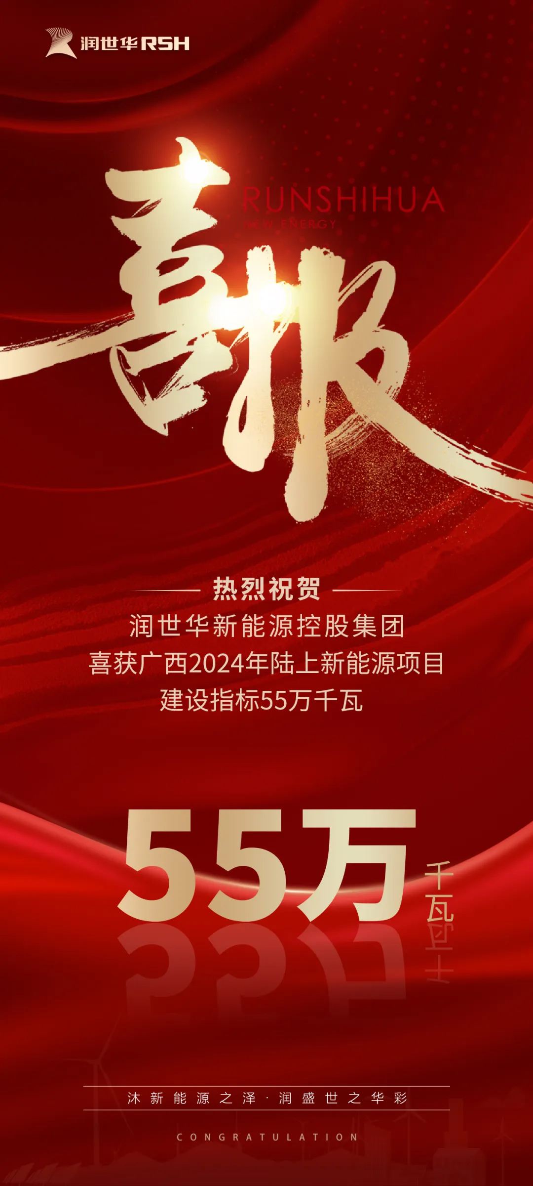 7月24日,广西壮族自治区能源局发布《关于印发2024年度陆上风电、集中式光伏发电项目建设方案的通知》,润世华新能源控股集团携手国电投上电(广西)新能源有限公司共同获得4个新能源风电项目的建设指标,项目总装机容量55万千瓦。