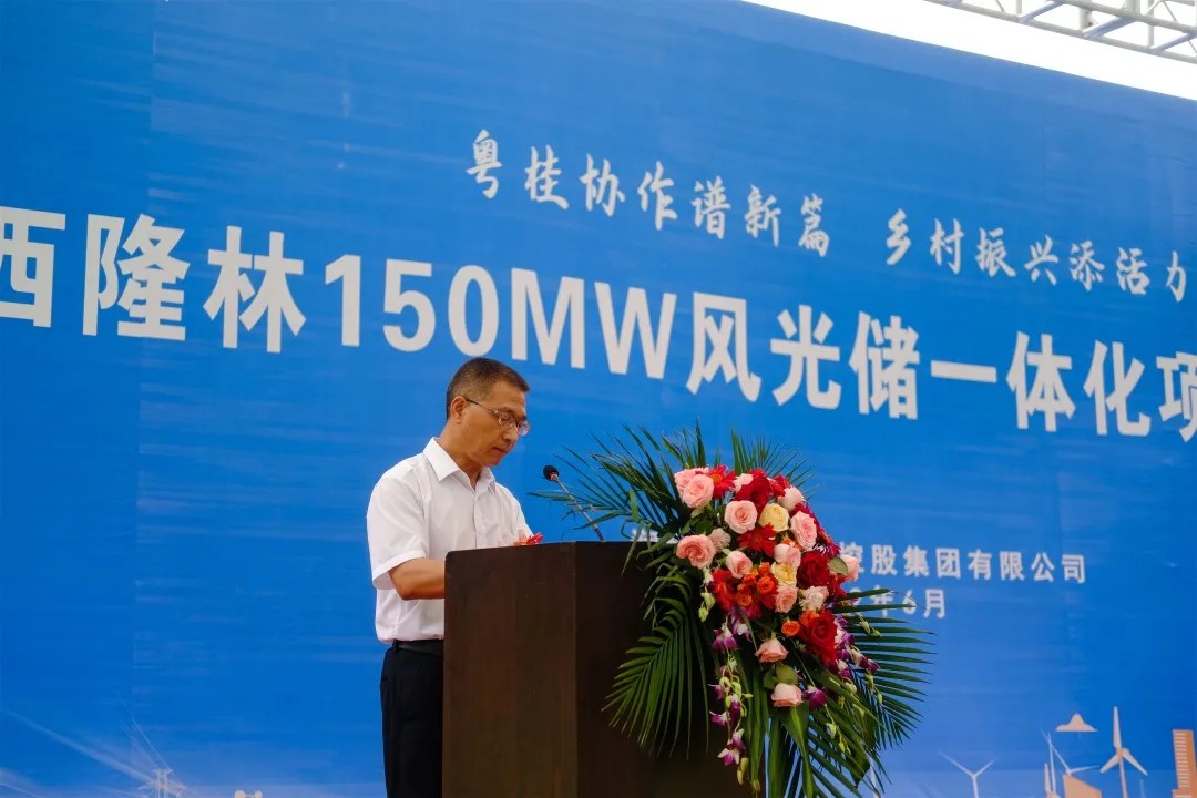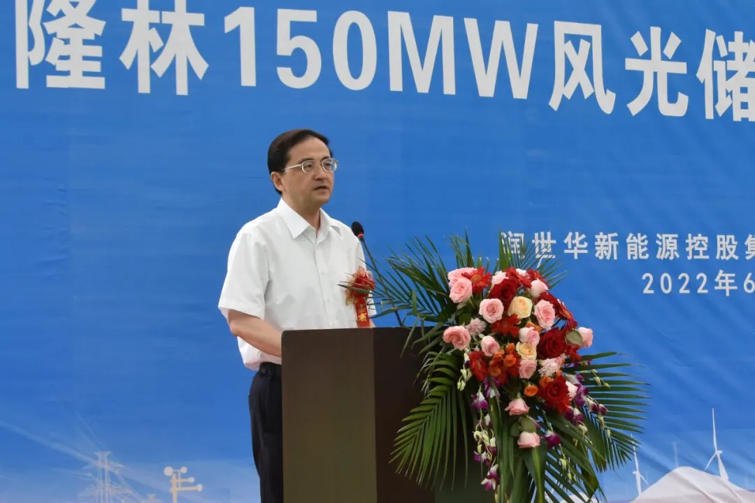 自治区政府邝兵秘书长在启动会上指出,本项目的实施,深入贯彻了习总书记讲的绿水青山就是金山银山,真正践行了粤桂协作、资源共享、合作共赢的理念,通过产业深入发展、促使百姓致富。广西隆林150MW风光储一体化项目是自治区能源局下发的2021年陆上风电保障性项目,第一批核准的项目,也是第一批开工建设的项目。项目实施,离不开各级政府、各职能部门的大力支持,更离不开润世华企业团队成员的想干事、真干事、实干事,希望百色市和隆林县政府成立专班推动项目快速实施,按计划目标早日实现并网发电。同时,将此作为广西新能源领域民营企业的示范,真正起到粤桂协作的示范!