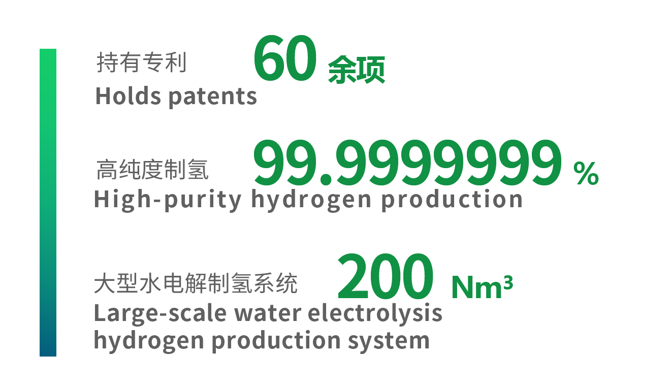 公司研发的可制取99.9999999%高纯氢的制氢设备和200标方大型水电解制氢系统目前国内领先。